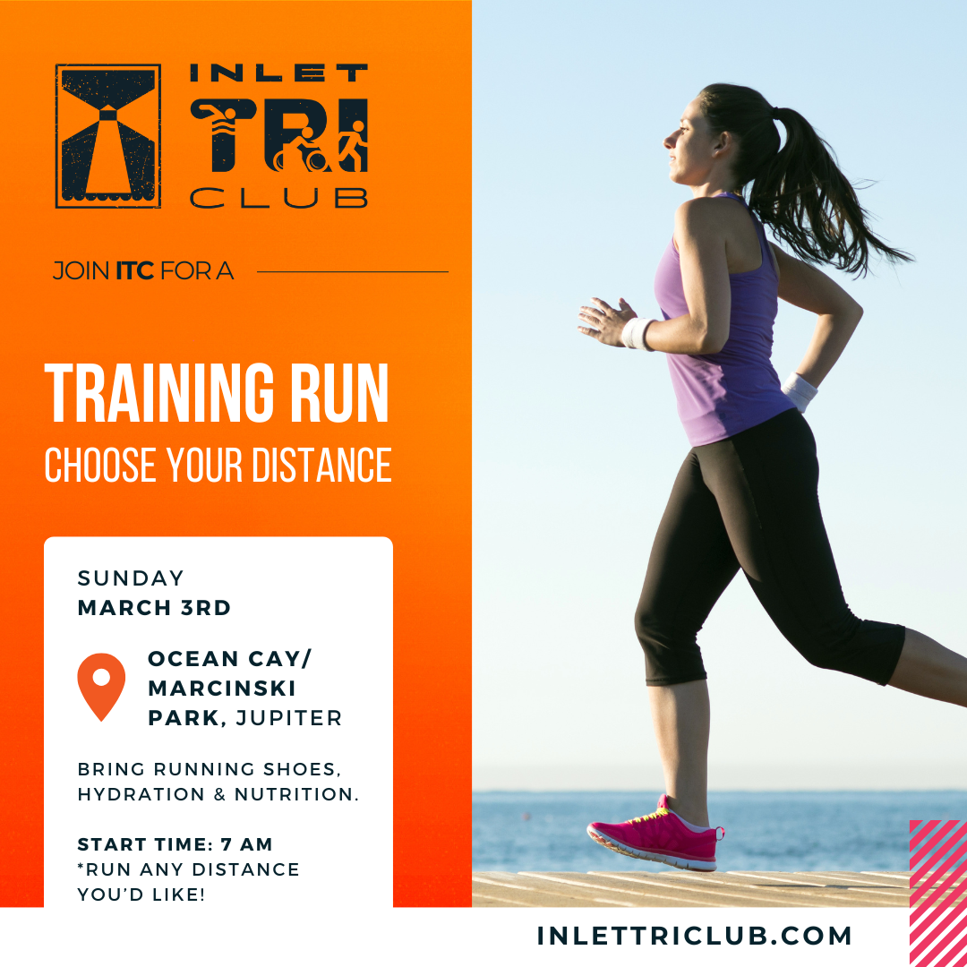 Join the club for a training fun run on Sunday, March 3rd! We’ll have a big group leaving at the same time from Marcinski/Ocean Cay Park in Jupiter. Our departure time will be 7 AM.