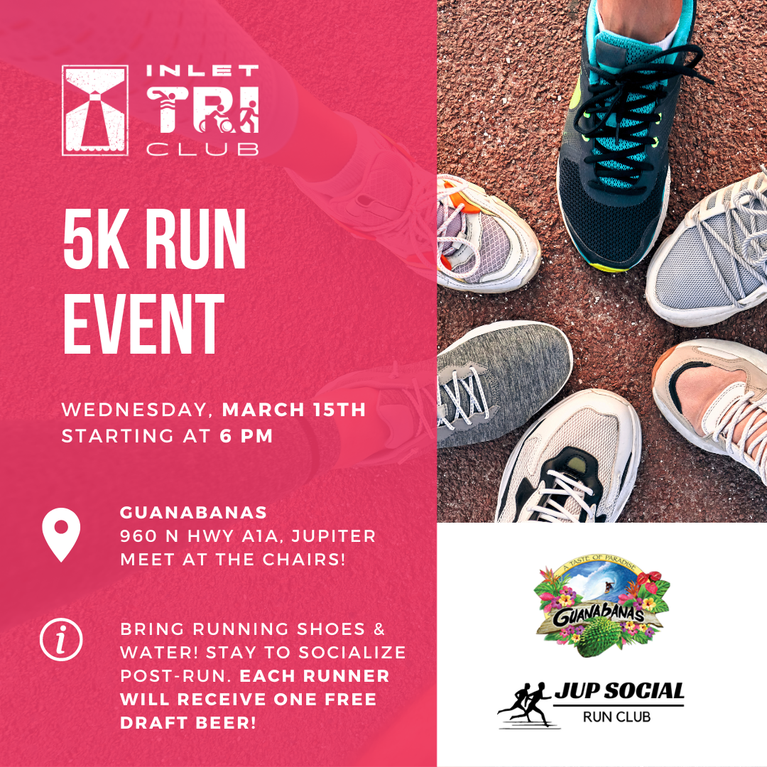 We’re joining forces with our good friends at the Jup Social Run Club & Guanabanas on Wednesday, March 15th at 6:00 PM for a 5k run + social event! Meet us by the big tropical Adirondack chairs — and even better, stay for the fun and receive one FREE draft beer!