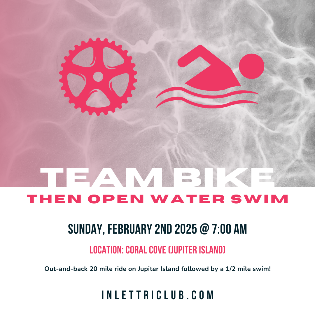 We’re kicking off February with a great training opportunity! Join us on Sunday, February 2nd, for a bike and swim combo. Due to water temps in the upper 50s, we’ll START with a 20-mile out-and-back ride on Jupiter Island at 7:00am, followed by an optional 1/2 mile open water swim.