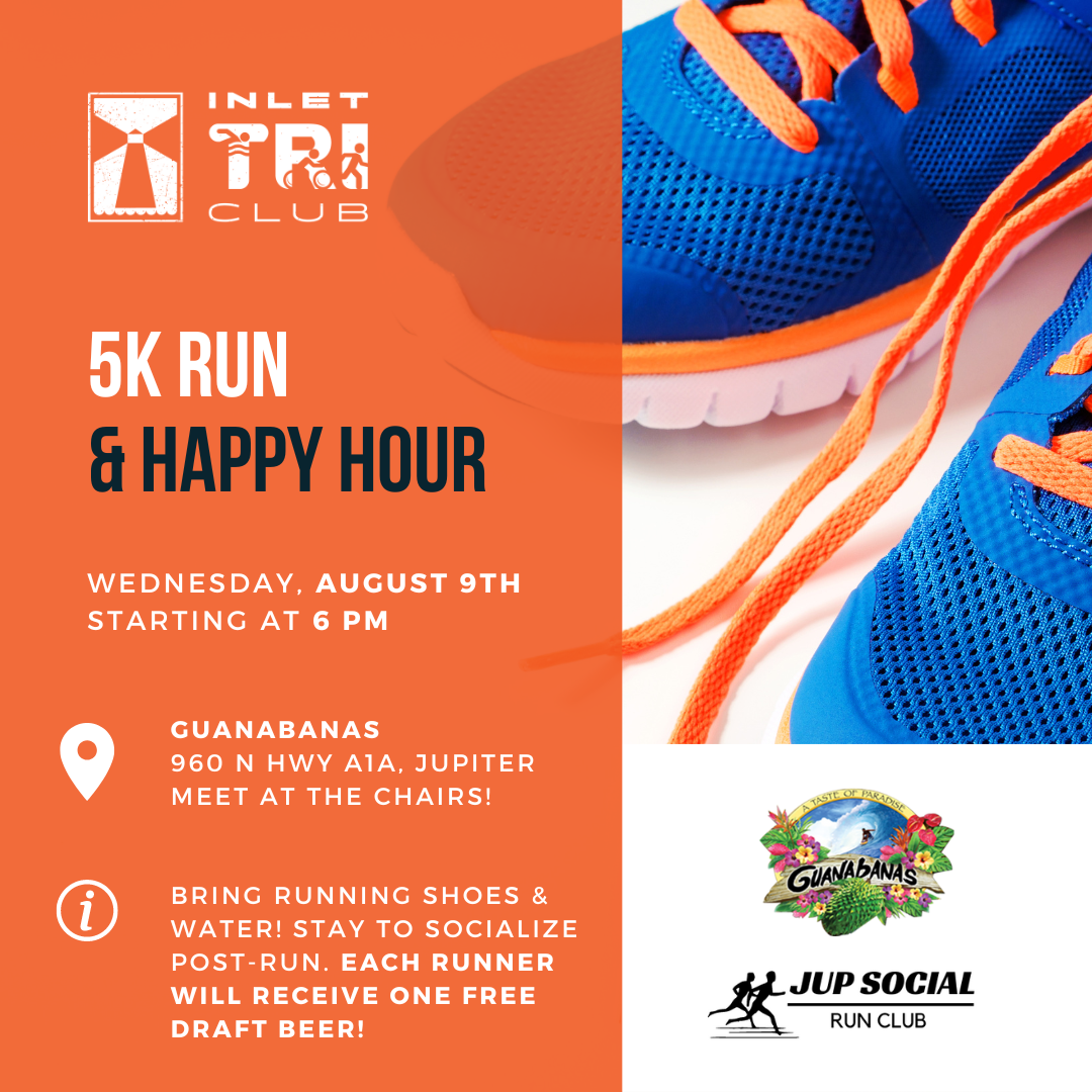 We’re joining forces with our good friends at the Jup Social Run Club & Guanabanas on Wednesday, August 9th at 6:00 PM for a 5k run + happy hour! Meet us by the big tropical Adirondack chairs — and even better, stay for the fun and receive one FREE draft beer!